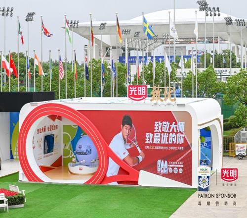 大师赛现场,以网球拍为灵感打造的光明致优展台,俨然成为全场焦点,创意展台设计与新颖趣味互动吸引众多观赛者驻足。