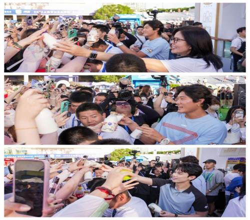 随后,光明优倍品牌代言人吴磊的空降,再次点燃全场。现场,青春活力的吴磊与郎平、张之臻共同化身“光明鲜活店长”,亲手为场外观众递上大师杯限定特调饮品、光明致优和光明优倍鲜牛奶等饮品,让每一位接过饮品的观众,都能直观感受到“近距离接触星光”的惊喜与“品尝鲜活营养”的满足。