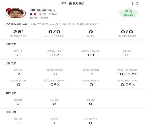 埃基蒂克战曼联全场数据:替补出场2脚射门打偏未能救主