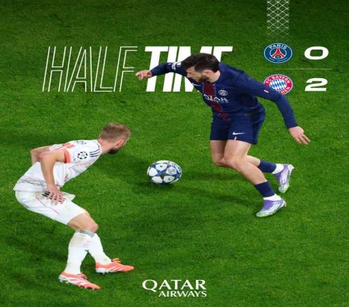 上半场比赛结束,我们暂时以两球落后拜仁慕尼黑。