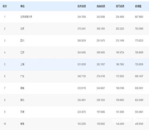 本届全运会花样游泳集体项目由技术自选、自由自选、技巧自选三项组成,其中技术自选与自由自选已于11月13日完赛,11 月 14 日的技巧自选为最后一项角逐。北京体育大学队在前两项已建立优势的基础上,凭借技巧自选的稳定发挥,最终以总分867.9665分成功登顶;北京队、四川队分别以783.5989分、773.6233分位列第二、三名。广东队位列第六位。