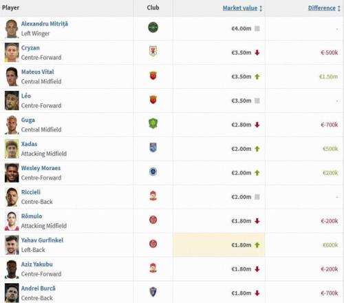 北京时间12月17日,德转更新新一期中超球员身价。本期榜单前18均为外籍球员。外援身价榜前十中,浙江队外援米特里策以400万欧居首,克雷桑、维塔尔、莱昂纳多并列第二。